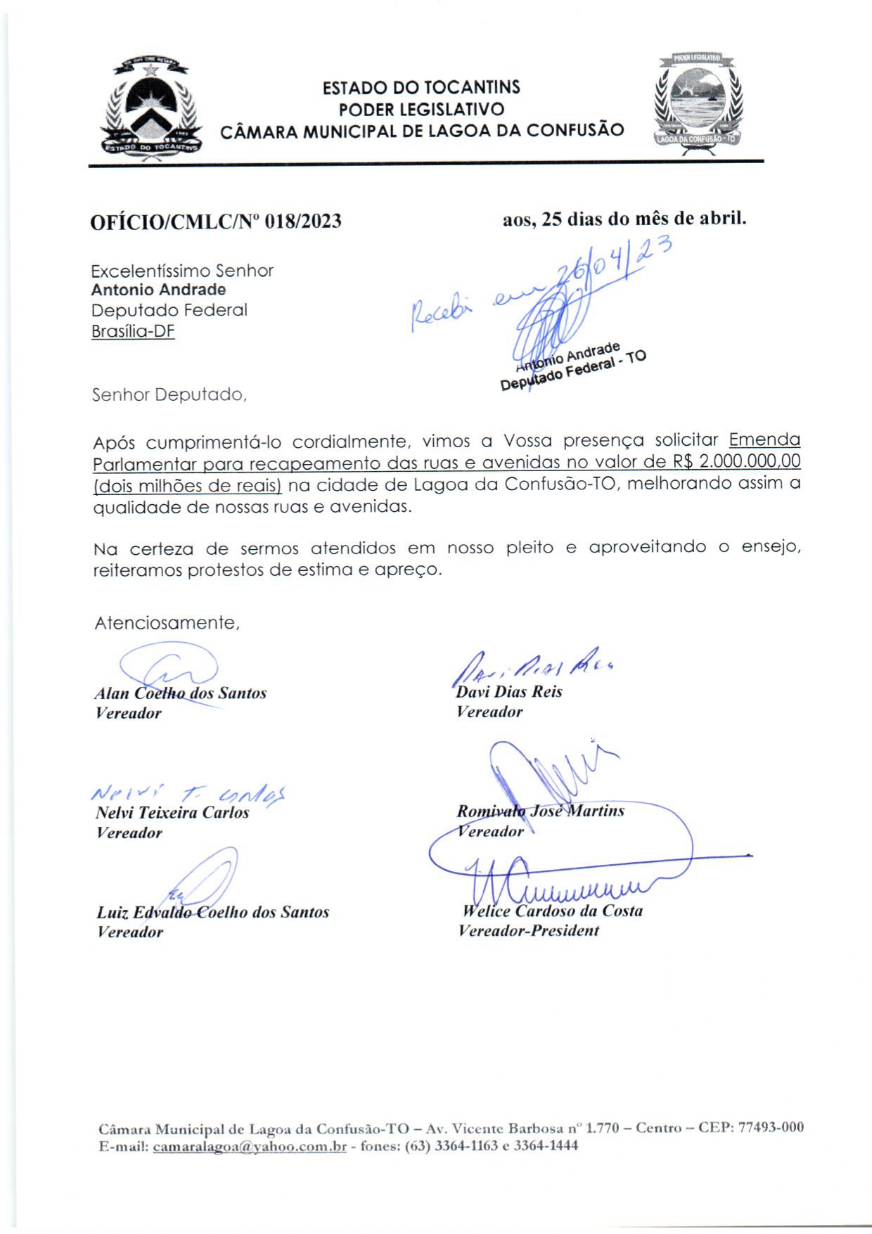 PODER LEGISLATIVO DE LAGOA DA CONFUSÃO - ESTADO DO TOCANTINS